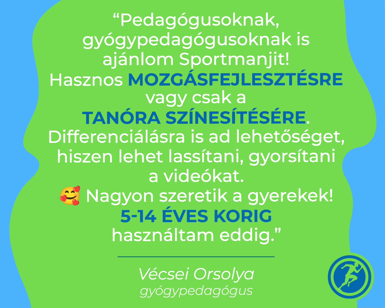 – Nagyon jó dolgot kezdtetek el, sokaknak ajánlottam a sportmanjit, mert suli után levezetésnek, vagy tanulás előtt ráhangolódásnak is remek. Arról nem is beszélve, hogy fejlesztéseken is jól hasznosítható, sőt a fejlesztés jellegét is teljesen elveszi ez a játékos módszer, biztos vagyok benne, hogy nagyobb kedvvel mennek ki a fejlesztőpedagógussal a gyerekek, ha lehet sportmanjizni is.