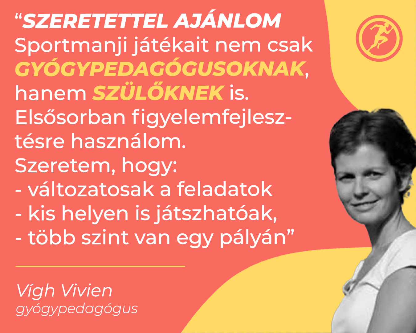 -A 3. osztályos látássérült kislánnyal is rendszeresen gyakoroltunk. Az ő keze nagyon ügyes, térben is jobban tájékozódik. Imádja, egy végtelenül zárkózott lányból, egy nagyon nyitott személyiség lett. 3. éve foglalkozok vele – ez hosszú folyamat eredménye – de a Sportmanji is sokat tett hozzá. Nagyon okos, nem szeret unatkozni. Szereti a kihívásokat, a változatosságot. A kudarc, hibázás lehetőségét még gyakoroljuk – az ezeknek való könnyed feldolgozását. Sportmanji mindig sikert jelentett neki, olyat, amiért meg kell dolgozni – nem a hétköznapi módon.