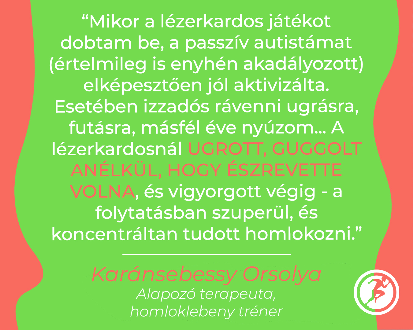 -Imádta a pályákat a 3. osztályos, örökbe fogadott fiú. Nehezen tanul – nem az esze miatt, hanem az érzelmei visszahúzzák, elviszik a fókuszát. Hozzá találtam a legnehezebben a „kódot” – a Sportmanji óta imád járni. Addig elfelejtett jönni, menni kellett érte, emlékeztetni az órára. Azóta jön magától, dinamikusabb lett, nyitottabb, aktívabb, együttműködőbb.