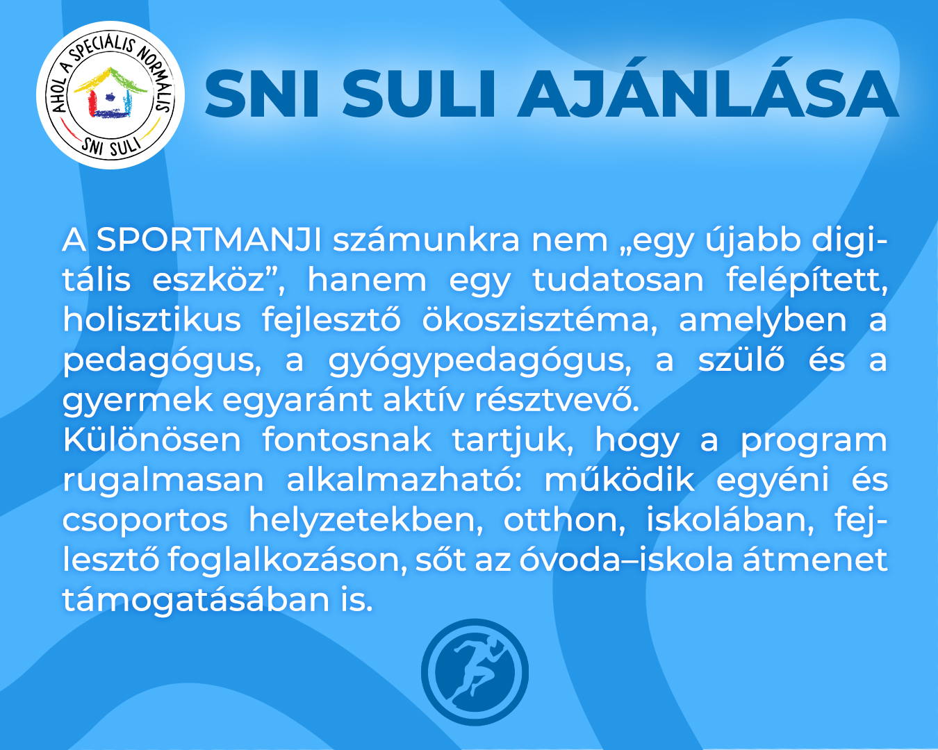 – Nagyon jó dolgot kezdtetek el, sokaknak ajánlottam a sportmanjit, mert suli után levezetésnek, vagy tanulás előtt ráhangolódásnak is remek. Arról nem is beszélve, hogy fejlesztéseken is jól hasznosítható, sőt a fejlesztés jellegét is teljesen elveszi ez a játékos módszer, biztos vagyok benne, hogy nagyobb kedvvel mennek ki a fejlesztőpedagógussal a gyerekek, ha lehet sportmanjizni is.